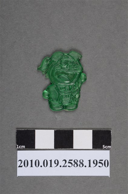 1.本物件為卡通哆啦A夢(小叮噹)之哆啦A夢尪仔仙。硬質塑膠材質,扁平,單一綠色,雙面浮雕圖案,兩面圖案相同。圖案為打扮成日本武士的哆啦A夢,綁有頭帶,頭帶中間有圖案,額頭前有2片瀏海,後腦杓綁1撮頭髮,張嘴笑,腰間插有1把刀,其右手往上舉。