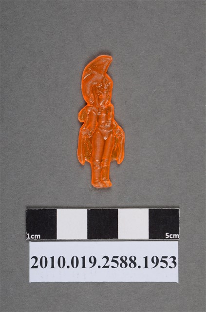 1.本物件為漫畫七龍珠之琪琪尪仔仙。硬質塑膠材質,扁平,單一橘色,雙面浮雕圖案,兩面圖案相同。圖案為站姿人型,女性,頭戴頭盔,頭盔上有立體彎月造型,服裝有披風和靴子等,雙手抓住披風,雙腳併攏。琪琪是主角孫悟空的妻子。