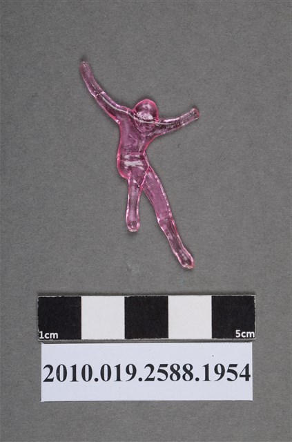 1.本物件為雙手高舉人型尪仔仙。硬質塑膠材質,扁平,單一粉紅色,雙面浮雕圖案,兩面圖案相同。圖案為戴有頭盔之人型,無法辨識服裝類型,雙手向上舉,一腳伸直,另一腳彎曲,呈從上往下跳之姿勢。左手略短。