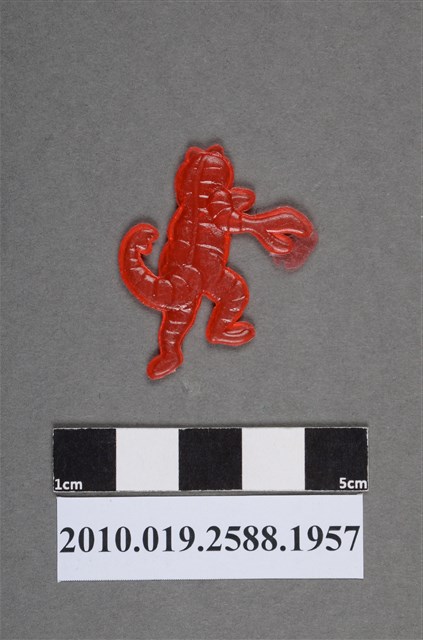 1.本物件為鉗狀手恐龍型尪仔仙。硬質塑膠材質,扁平,單一橘紅色,雙面浮雕圖案。正面圖案為站姿恐龍,手腳有橫條紋路,有長尾巴,雙手為鉗狀。
