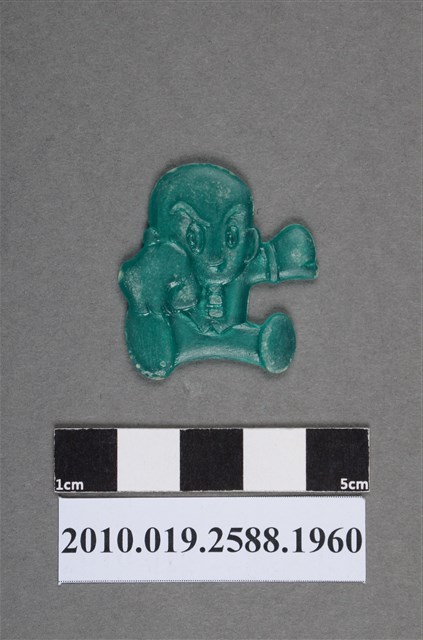 1.本物件為拳擊人型尪仔仙。硬質塑膠材質,扁平,單一不透明綠色,雙面浮雕圖案,兩面圖案相同。圖案為光頭男生,眉毛明顯,呈坐姿,雙手握拳,有一拳往前擊。2.尪仔仙尺寸大致可分成小、中、大型,小型約長2-5公分,中型約長8-15公分,顏色以單色為主。有些大型的則可長達30公分左右,以菩薩、神仙和民間傳說故事人物等造型為主,塗上金銀紅黃彩漆等亮色。1960、70年代的尪仔仙多以民間傳說故事、歌仔戲、布袋戲人物為造型。1980年代改以卡通、電玩、漫畫人物造型為主。常見玩法之一為兩人(或多人)各持一只尪仔仙,輪流用手指彈射,看誰的尪仔仙先疊在對方上面,便可贏得對方用來對戰或是約定的尪仔仙。