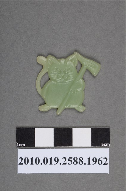 1.本物件為漫畫七龍珠之貓仙人尪仔仙。硬質塑膠材質,扁平,單一不透明淡綠色,雙面浮雕圖案,兩面圖案相同。圖案為站立的胖貓,一手拿著拐杖,拐杖頂端為錐形體文物,尾巴翹起。
