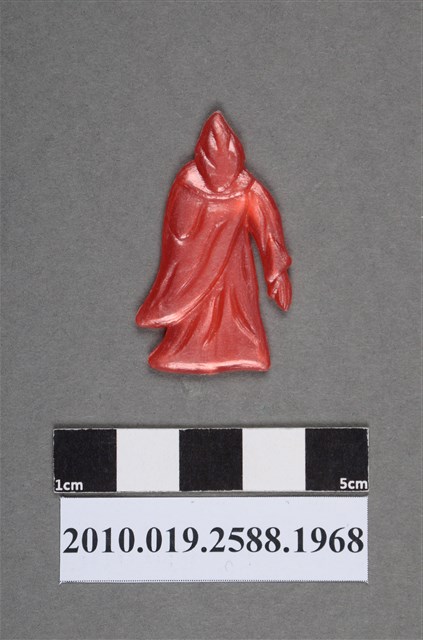 1.本物件為紅色人型尪仔仙。硬質塑膠材質,扁平,單一不透明紅色,雙面浮雕圖案。正面圖案為站立人型,男性,全身被斗篷罩住,篷長至腳,全身只有臉部和右手掌露出。