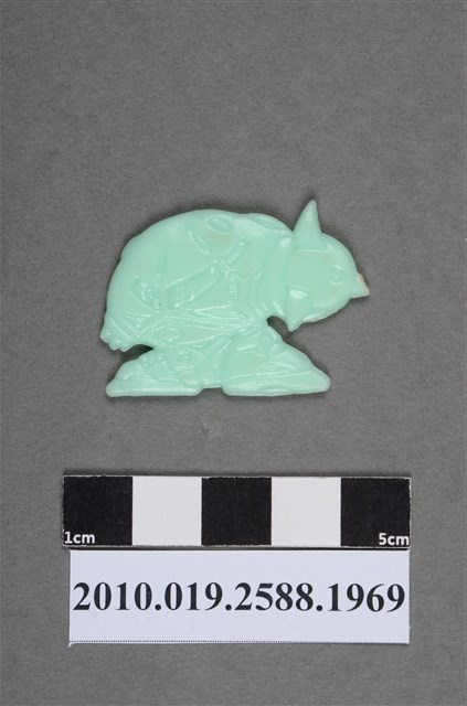 1.本物件為綠色機器人型尪仔仙。硬質塑膠材質,扁平,單一不透明綠色,雙面浮雕圖案,兩面圖案相同。圖案為站立機器人型,頭頂呈圓弧形,一手可見指頭,另一手與武器結合,該武器有角狀物,雙腳比例大。