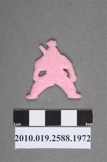 1.本物件為粉紅色人型尪仔仙。硬質塑膠材質,扁平,單一不透明粉紅色,雙面浮雕圖案,兩面圖案於臉部不相同。圖案為人型,頭上綁有1撮頭髮,背上揹著1把武器,身穿功夫服,腰間有繫帶,雙腳往左右跨步分開。2.尪仔仙尺寸大致可分成小、中、大型,小型約長2-5公分,中型約長8-15公分,顏色以單色為主。有些大型的則可長達30公分左右,以菩薩、神仙和民間傳說故事人物等造型為主,塗上金銀紅黃彩漆等亮色。1960、70年代的尪仔仙多以民間傳說故事、歌仔戲、布袋戲人物為造型。1980年代改以卡通、電玩、漫畫人物造型為主。常見玩法之一為兩人(或多人)各持一只尪仔仙,輪流用手指彈射,看誰的尪仔仙先疊在對方上面,便可贏得對方用來對戰或是約定的尪仔仙。