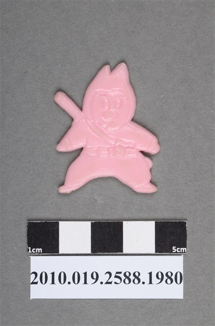 1.本物件為忍者尪仔仙。硬質塑膠材質,扁平,單一不透明粉紅色,雙面浮雕圖案,兩面圖案相同。圖案為穿著忍者服的人型,頭套頂呈2個尖角,腰間有腰帶,背上揹有長型武器,雙手斜伸,雙腳往左右跨步分開。