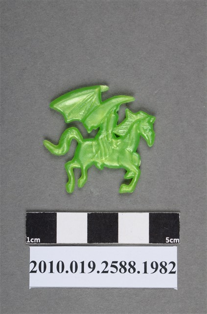 1.本物件為騎馬人型尪仔仙。硬質塑膠材質,扁平,單一不透明綠色,雙面浮雕圖案。正面圖案為1人背上有翅膀,翅膀展翅,坐在馬上,馬似奔跑貌。