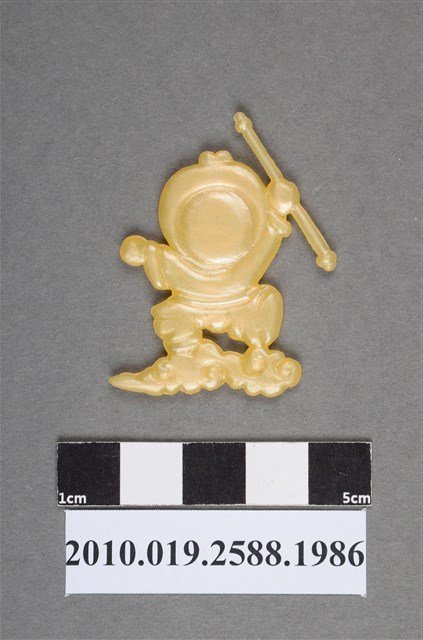 1.本物件為卡通哆啦A夢(小叮噹)之哆啦A夢尪仔仙。硬質塑膠材質,扁平,單一不透明黃色,雙面浮雕圖案。正面圖案為打扮成孫悟空的哆啦A夢,頭上戴有金箍,左右臉頰有鬍鬚,張嘴笑,左手平伸,右手舉著金箍棒,站在筋斗雲上。