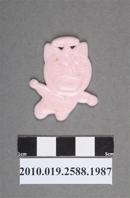 1.本物件為卡通哆啦A夢(小叮噹)之哆啦A夢尪仔仙。硬質塑膠材質,扁平,單一不透明粉紅色,雙面浮雕圖案,兩面圖案相同。圖案為正在飛的哆啦A夢,頭頂有正在轉動的飛行器,左右臉頰上各有3根鬚,張嘴,表情呈現緊張失措貌,雙手平伸。