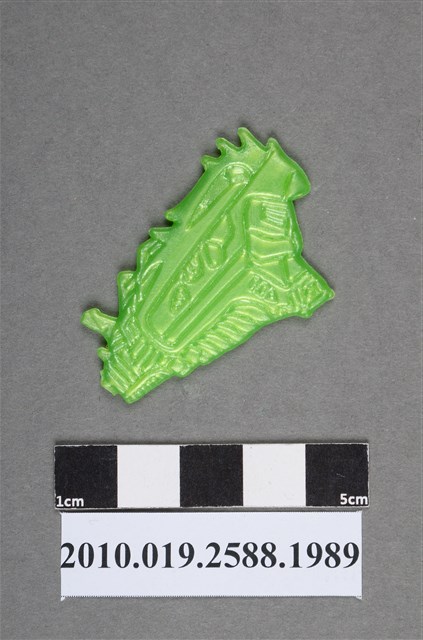1.本物件為綠色尪仔仙。硬質塑膠材質,扁平,單一不透明綠色,雙面浮雕圖案,兩面圖案相同。難以判斷圖案為何,呈不規則狀,較窄的一邊似有引擎管線裝置。