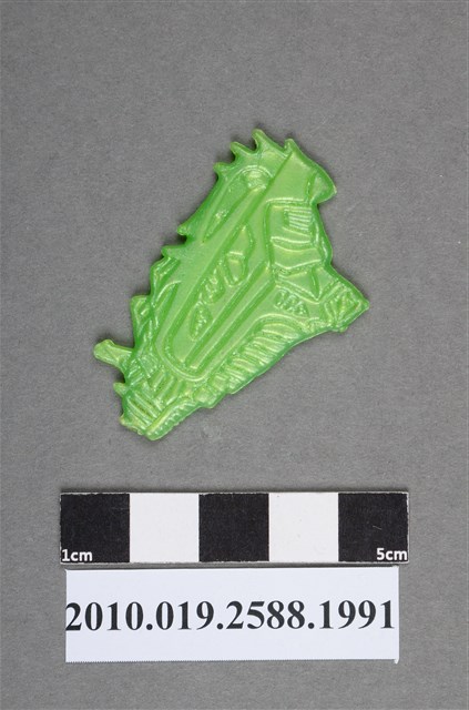 1.本物件為綠色尪仔仙。硬質塑膠材質,扁平,單一不透明綠色,雙面浮雕圖案,兩面圖案相同。難以判斷圖案為何,呈不規則狀,較窄的一邊似有引擎管線裝置。