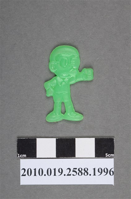 1.本物件為卡通哆啦A夢(小叮噹)之大雄(野比大雄)尪仔仙。硬質塑膠材質,扁平,單一不透明綠色,雙面浮雕圖案,兩面圖案相同。圖案為戴著眼鏡的大雄,一眼張開,一眼瞇著,嘴巴嘟起來,頸部綁有蝴蝶結,穿短褲。其為站立姿勢,一手伸出握拳,另一手放腰間。