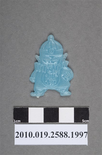 1.本物件為漫畫七龍珠之皮拉夫(炒飯大王)尪仔仙。硬質塑膠材質,扁平,單一不透明淡藍色,雙面浮雕圖案,兩面圖案相同。圖案是皮拉夫手裡拿著一顆龍珠,其頭戴瓜皮帽,有對尖耳,服裝在脖子上有一圈造型,衣服有「炒飯」字樣,一手拿著龍珠,一手自然垂下。在漫畫設定中,皮拉夫是反派角色。