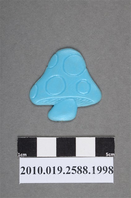 1.本物件為電玩超級瑪利歐兄弟(超級瑪利)之蘑菇(香菇)尪仔仙。硬質塑膠材質,扁平,單一不透明藍色,雙面浮雕圖案,兩面圖案相同。圖案為蕈帽上有5個疣點,底下可見蕈摺,有蕈柄。在電玩中,瑪利歐吃到蘑菇可獲得神力。