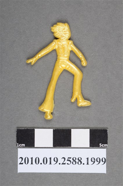 1.本物件為黃色人型尪仔仙。硬質塑膠材質,扁平,單一不透明黃色,雙面浮雕圖案。正面圖案為站立男性,其頭髮有被風吹動,飄向一邊的樣子,衣服有領子,褲管為喇叭褲型式,左手往側邊伸出,左腳往外跨出。