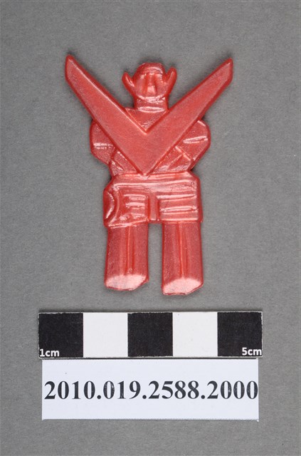1.本物件為紅色機器人型尪仔仙。硬質塑膠材質,扁平,單一不透明紅色,雙面浮雕圖案。正面圖案為站立機器人,頭部兩側有角,背後有大V字型,腰帶中間有星形圖案,不見其手部,腳之底部不見腳掌,為方形。