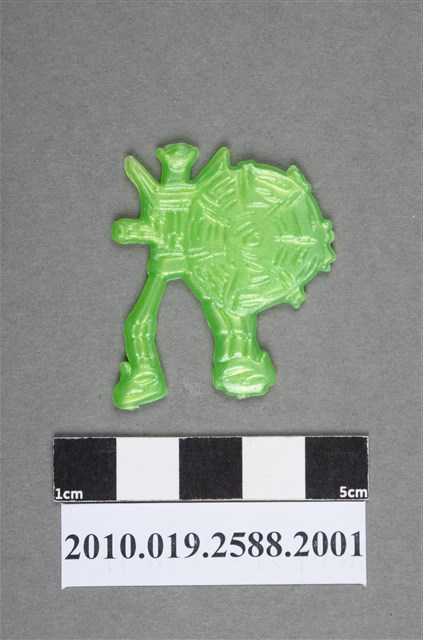 1.本物件為綠色機器人型尪仔仙。硬質塑膠材質,扁平,單一不透明綠色,雙面浮雕圖案。正面圖案為站立機器人,肩膀部分有尖角設計,左手舉著,右手拿著圓盤狀物品,其上有放射狀物體。