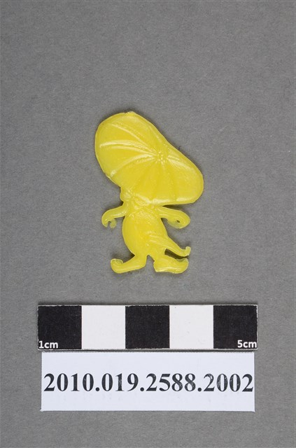 1.本物件為古裝科幻武俠劇靈山神劍之靈芝草人(哎呀呀)尪仔仙。硬質塑膠材質,扁平,單一黃色,雙面浮雕圖案。正面圖案為擬人化的靈芝,頭上有蕈傘,大耳朵,有手腳和尾巴,雙手往外平伸,腳尖往上翹。