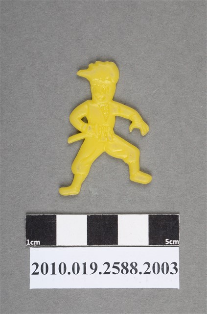 1.本物件為持劍人型尪仔仙。硬質塑膠材質,扁平,單一不透明黃色,雙面浮雕圖案,兩面圖案相同。圖案為站立男性,髮型斜向一邊,身穿背心式功夫服,腰間繫有腰帶,一手裡握住劍鞘,另一隻手張開,似要拉出劍。