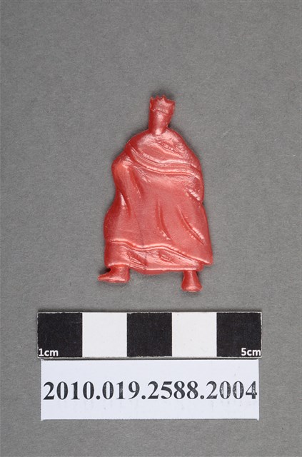 1.本物件為大袍人型尪仔仙。硬質塑膠材質,扁平,單一不透明紅色,雙面浮雕圖案。正面圖案為站立男性人型,整個身體包括雙手被大袍包住,可見大袍之皺褶。