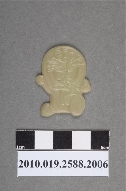 1.本物件為卡通哆啦A夢(小叮噹)之哆啦A夢尪仔仙。硬質塑膠材質,扁平,單一不透明乳白色,雙面浮雕圖案,兩面圖案相同。圖案為正在走路的哆啦A夢,左右臉頰上各有3根鬚,張嘴而笑,可見其脖子上有鈴鐺,肚子上有百寶袋,其雙手舉起,呈興高采烈走路貌。