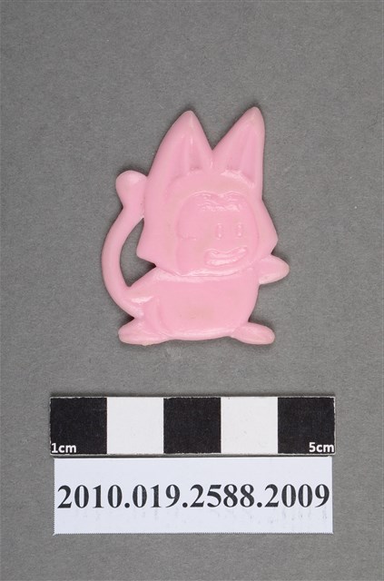 1.本物件為漫畫七龍珠之普亞路(烏兒)尪仔仙。硬質塑膠材質,扁平,單一不透明粉紅色,雙面浮雕圖案,兩面圖案相同。圖案為貓型,有2個立起來的耳朵,尾巴翹起,表情呈焦慮貌。
