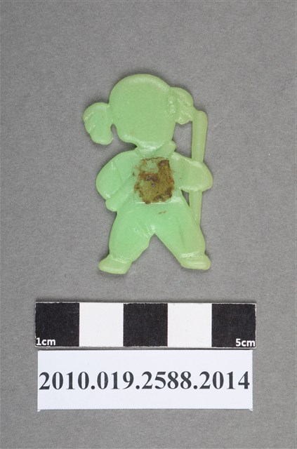 1.本物件為持棍人型尪仔仙。硬質塑膠材質,扁平,單一不透明綠色,雙面浮雕圖案。正面圖案為站立小女孩,頭上綁著2個馬尾,身著跆拳道服,綁有腰帶,左手插腰,要手拿著長棍。