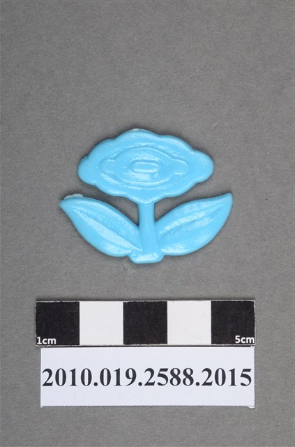 1.本物件為電玩超級瑪利歐兄弟(超級瑪利)之神奇花(火球花,火力花、金花)尪仔仙。硬質塑膠材質,扁平,單一不透明藍色,雙面浮雕圖案,兩面圖案相同。圖案為花莖左右帶有1片葉子的花朵。花朵中間呈橢圓形,代表花蕊,外面有2層波浪狀,代表花瓣。在遊戲設定中,玩家如果取得此花,可放出火焰攻擊敵人。