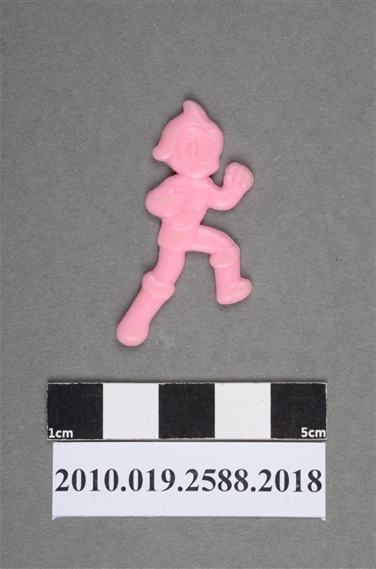 1.本物件為漫畫原子小金剛之小金剛尪仔仙。硬質塑膠材質,扁平,單一不透明粉紅色,雙面浮雕圖案,兩面圖案相同。圖案為頭部有尖角造型的小金剛雙手握拳,可見其裝扮有腰帶、短褲和靴子,雙腳略微彎曲,呈戰鬥姿勢。