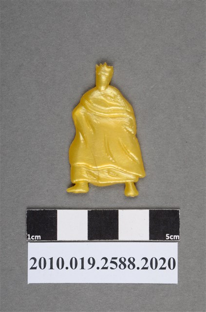 1.本物件為大袍人型尪仔仙。硬質塑膠材質,扁平,單一不透明黃色,雙面浮雕圖案。正面圖案為站立男性人型,整個身體包括雙手被大袍包住,可見大袍之皺褶。