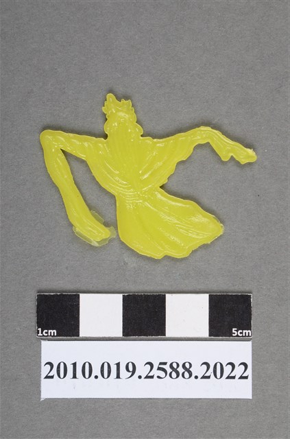 1.本物件為古代裙裝人型尪仔仙。硬質塑膠材質,扁平,單一不透明黃色,雙面浮雕圖案。正面圖案為飛天仙女的形象,其髮型上有裝飾,著古代裙裝,雙手往左右打開撐開帔帛,裙底有飄動的感覺。尪仔仙有破損。2.尪仔仙尺寸大致可分成小、中、大型,小型約長2-5公分,中型約長8-15公分,顏色以單色為主。有些大型的則可長達30公分左右,以菩薩、神仙和民間傳說故事人物等造型為主,塗上金銀紅黃彩漆等亮色。1960、70年代的尪仔仙多以民間傳說故事、歌仔戲、布袋戲人物為造型。1980年代改以卡通、電玩、漫畫人物造型為主。常見玩法之一為兩人(或多人)各持一只尪仔仙,輪流用手指彈射,看誰的尪仔仙先疊在對方上面,便可贏得對方用來對戰或是約定的尪仔仙。