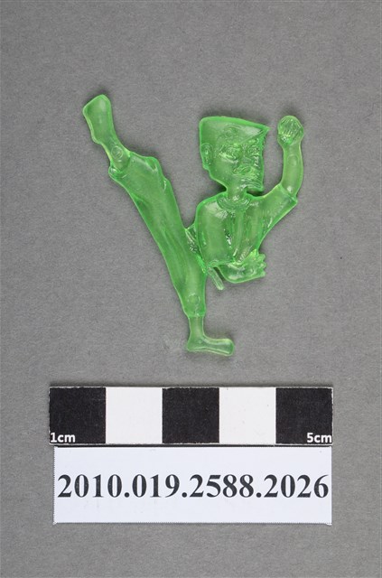 1.本物件為功夫人型尪仔仙。硬質塑膠材質,扁平,單一綠色,雙面浮雕圖案,兩面圖案相同。圖案為以單腳站立的男性,其一手握拳舉起,另一手放於腹部前,一腳站立,另一隻腳拉直抬起,腳掌超過頭部。2.尪仔仙尺寸大致可分成小、中、大型,小型約長2-5公分,中型約長8-15公分,顏色以單色為主。有些大型的則可長達30公分左右,以菩薩、神仙和民間傳說故事人物等造型為主,塗上金銀紅黃彩漆等亮色。1960、70年代的尪仔仙多以民間傳說故事、歌仔戲、布袋戲人物為造型。1980年代改以卡通、電玩、漫畫人物造型為主。常見玩法之一為兩人(或多人)各持一只尪仔仙,輪流用手指彈射,看誰的尪仔仙先疊在對方上面,便可贏得對方用來對戰或是約定的尪仔仙。
