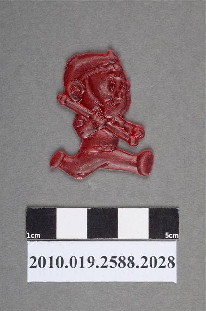 1.本物件為孫悟空尪仔仙。硬質塑膠材質,扁平,單一紅色,雙面浮雕圖案,兩面圖案相同。圖案為Q版頭戴金箍的孫悟空,肩上扛著金箍棒,呈跑步姿勢。孫悟空為西遊記之角色。