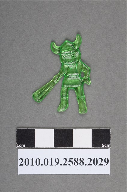 1.本物件為卡通北海小英雄之小威尪仔仙。硬質塑膠材質,扁平,單一綠色,雙面浮雕圖案。正面圖案為頭戴維京人帽子,腳穿靴子,左手拿棒子之男孩貌。