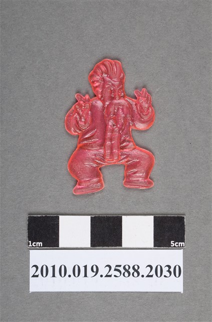 1.本物件為漫畫七龍珠之龜仙人尪仔仙。硬質塑膠材質,扁平,單一粉紅色,雙面浮雕圖案,兩面圖案相同。圖案是龜仙人為了讓孫悟空和克林精進武術而變裝為陳龍,戴上假髮。龜仙人雙手比YA,雙腳呈蹲馬步的姿勢。