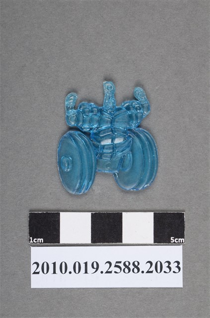 1.本物件為雙輪怪物尪仔仙。硬質塑膠材質,扁平,單一藍色,雙面浮雕圖案,兩面圖案相同。圖案為上半身為人型,下半身為雙輪之怪物,上半身有肌肉線條,雙手彎曲舉起。