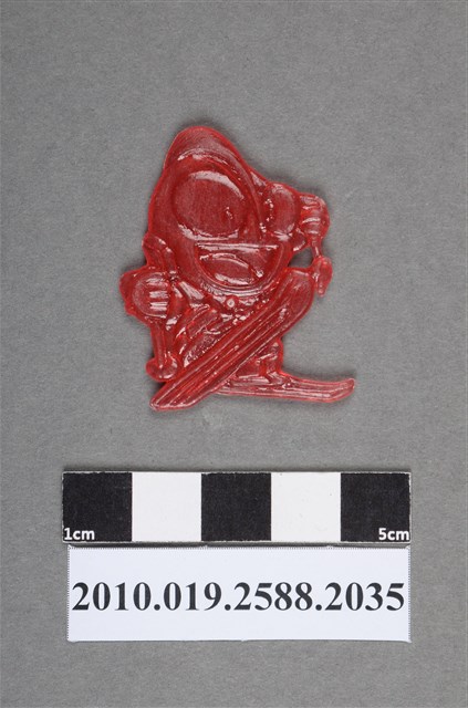 1.本物件為電視影集超人力霸王(奧特曼、鹹蛋超人)之奧特曼尪仔仙。硬質塑膠材質,扁平,單一紅色,雙面浮雕圖案,兩面圖案相同。圖案為Q版奧特曼在滑雪,張嘴,有橢圓形眼睛,頭罩上有立體彎月形造型,兩手握住雪杖,雙腳踩著滑雪雙板。
