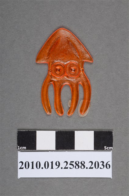 1.本物件為電玩超級瑪利歐兄弟(超級瑪利)之魷魚(烏賊)尪仔仙。硬質塑膠材質,扁平,單一橙色,雙面浮雕圖案,兩面圖案相同。圖案為4隻觸手的Q版軟體動物,型體較像魷魚,尾端的鰭呈三角形狀,有大眼睛。在遊戲設定中,大多出沒於水中關卡,以接觸方式攻擊玩家。
