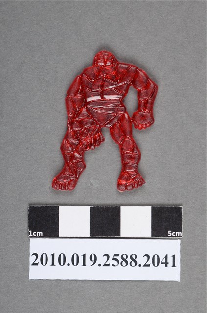 1.本物件為握拳人型尪仔仙。硬質塑膠材質,扁平,單一紅色,雙面浮雕圖案。正面圖案為彎腰站立人型,雙手握拳,身上有塊狀紋路,似石頭裂紋。