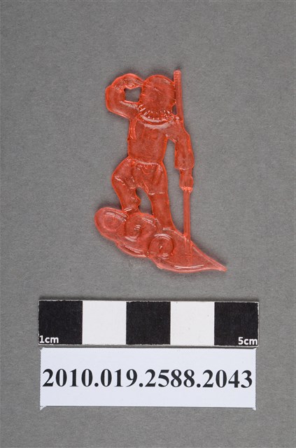1.本物件為孫悟空尪仔仙。硬質塑膠材質,扁平,單一橘色,雙面浮雕圖案。正面圖案為站在筋斗雲上的孫悟空,其一手握著金箍棒,另一手放在眼邊,呈看向遠方之姿。孫悟空為西遊記之角色。