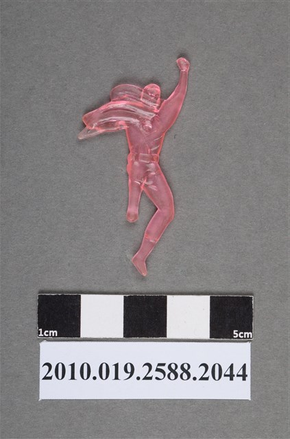1.本物件為超人尪仔仙。硬質塑膠材質,扁平,單一粉紅色,雙面浮雕圖案。正面圖案為超人穿著披風和超人裝,胸前有S字。超人披風飛起,右手向上舉,左手平舉彎曲,右腳微彎曲,左腳膝蓋抬起,為由上往下跳之姿。