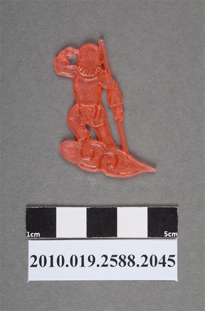 1.本物件為孫悟空尪仔仙。硬質塑膠材質,扁平,單一橘色,雙面浮雕圖案。正面圖案為站在筋斗雲上的孫悟空,其一手握著金箍棒,另一手放在眼邊,呈看向遠方之姿。孫悟空為西遊記之角色。