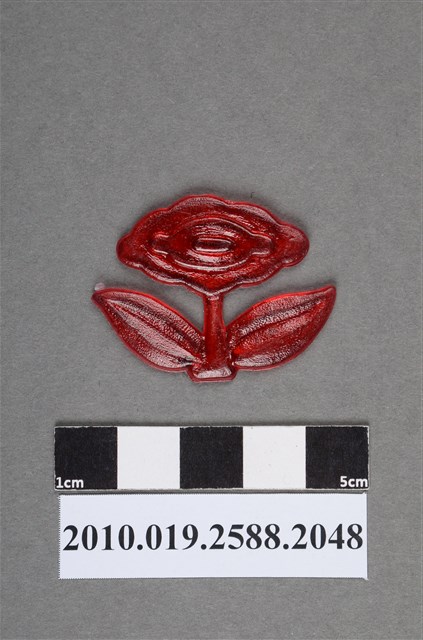 1.本物件為電玩超級瑪利歐兄弟(超級瑪利)之神奇花(火球花,火力花、金花)尪仔仙。硬質塑膠材質,扁平,單一紅色,雙面浮雕圖案,兩面圖案相同。圖案為花莖左右帶有1片葉子的花朵。花朵中間呈橢圓形,代表花蕊,外面有2層波浪狀,代表花瓣。在遊戲設定中,玩家如果取得此花,可放出火焰攻擊敵人。