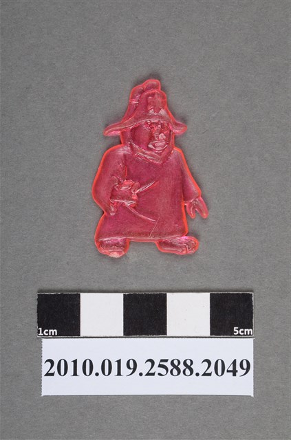 1.本物件為戴帽人型尪仔仙。硬質塑膠材質,扁平,單一粉紅色,雙面浮雕圖案,兩面圖案相同。圖案為擬人化的動物,五官不似人類,戴著大帽子,帽子正中間有6角星,穿著袍子,袍長至腳掌。其一手抓著袍子,故可見皺褶,一手自然垂放,雙腳著地。