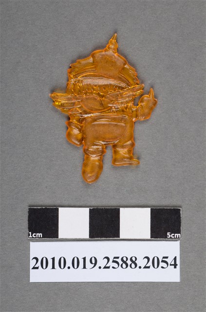 1.本物件為吊帶褲人型尪仔仙。硬質塑膠材質,扁平,單一橙色,雙面浮雕圖案。正面圖案為穿著吊帶褲的小孩,帶有頭冠,正中央有1隻螺旋角,吊帶褲中間有個口袋,一手舉起,比出中指,一手自然垂下,背後有1對翅膀。