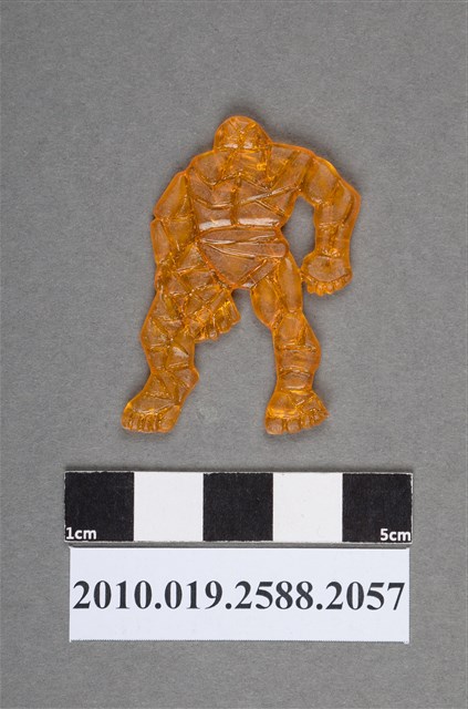 1.本物件為握拳人型尪仔仙。硬質塑膠材質,扁平,單一橙色,雙面浮雕圖案。正面圖案為彎腰站立人型,雙手握拳,身上有塊狀紋路,似石頭裂紋。