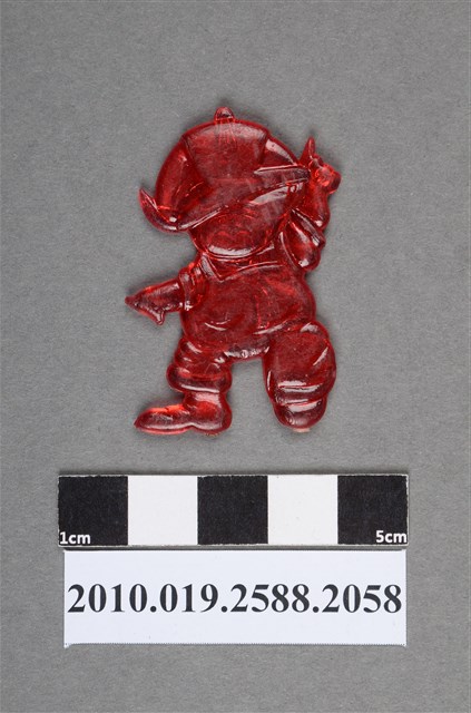1.本物件為戴帽人型尪仔仙。硬質塑膠材質,扁平,單一紅色,雙面浮雕圖案。正面圖案為單腳站立的小孩,戴著帽子,有尖耳,張嘴可見牙齒和舌頭,左手往旁邊伸,右手比出食指往上伸,以左腳站立,右腳抬起。