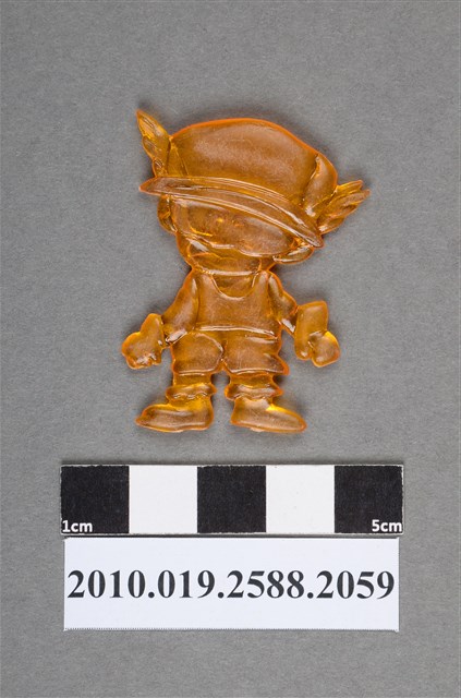1.本物件為戴帽人型尪仔仙。硬質塑膠材質,扁平,單一橙色,雙面浮雕圖案。正面圖案為戴著帽子的男孩,帽子兩側有翅嗙造型,張嘴笑,上衣為無袖背心,兩手戴手套。