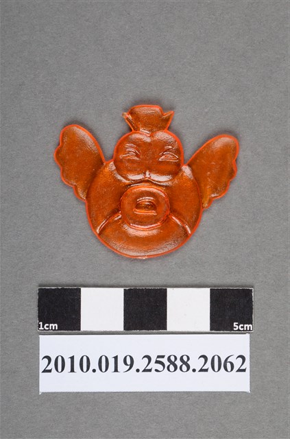 1.本物件為橙色魚型尪仔仙。硬質塑膠材質,扁平,單一橙色,雙面浮雕圖案,兩面圖案相同。圖案為魚與雞型結合的生物正面,頭上有冠,眼睛大,嘴唇厚,身體兩側有似魚鰭或翅膀構造,無腳。