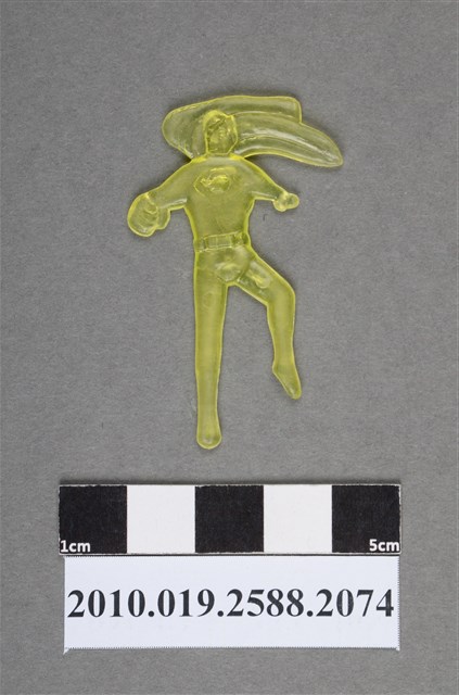 1.本物件為超人尪仔仙。硬質塑膠材質,扁平,單一黃色,雙面浮雕圖案。正面圖案為超人穿著披風和超人裝,披風揚起,胸前有S字,雙手握拳,左拳往前擊,右腳抬起。